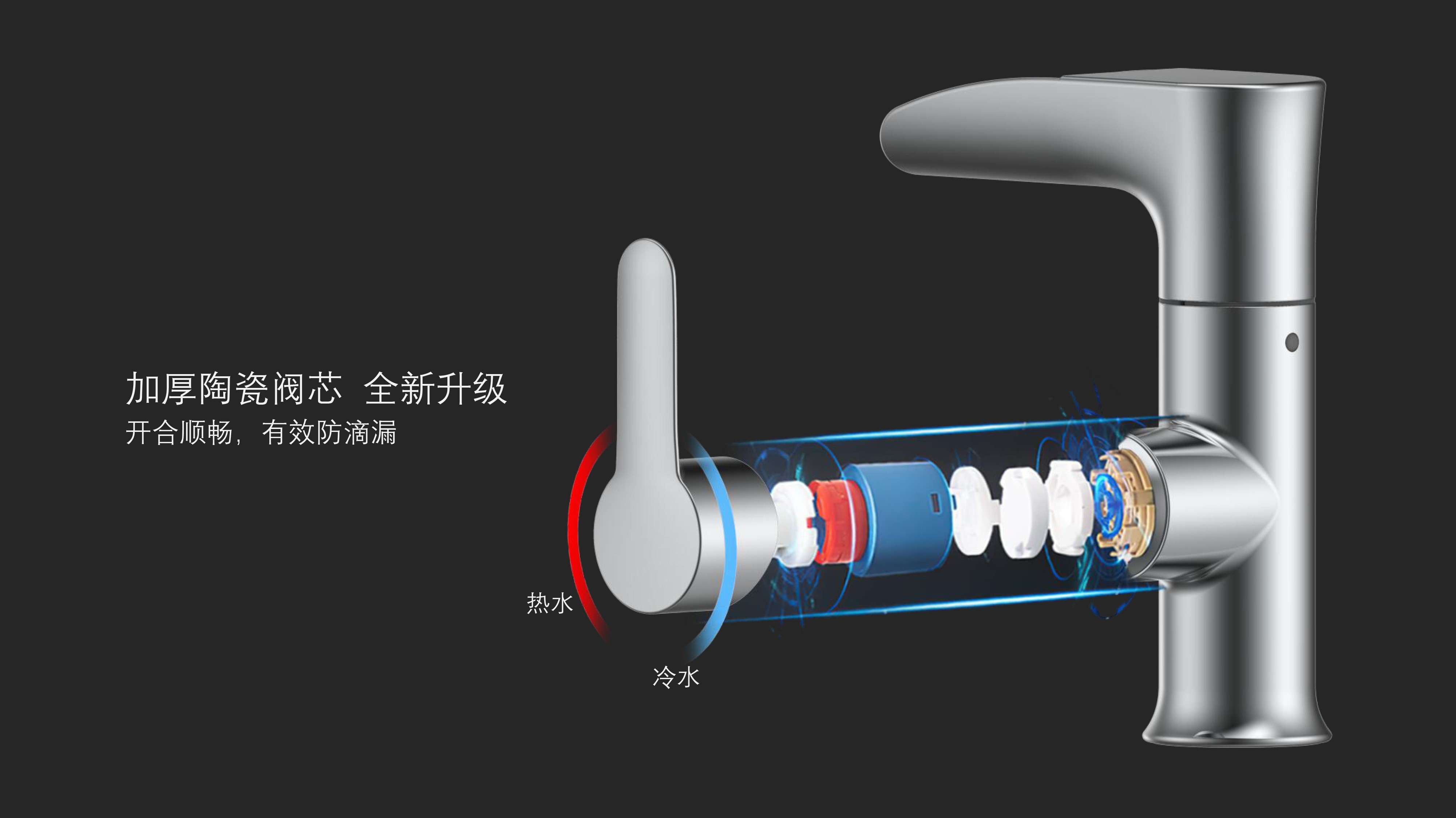 CUPC/ WaterSense/ NSF61/ AB1953(NSF372)認(rèn)證;簡約時尚設(shè)計;加厚陶瓷閥芯,開合順暢,有效防滴漏;LED三種顏色-涼水呈藍(lán)色、溫水呈綠色、熱水呈紅色