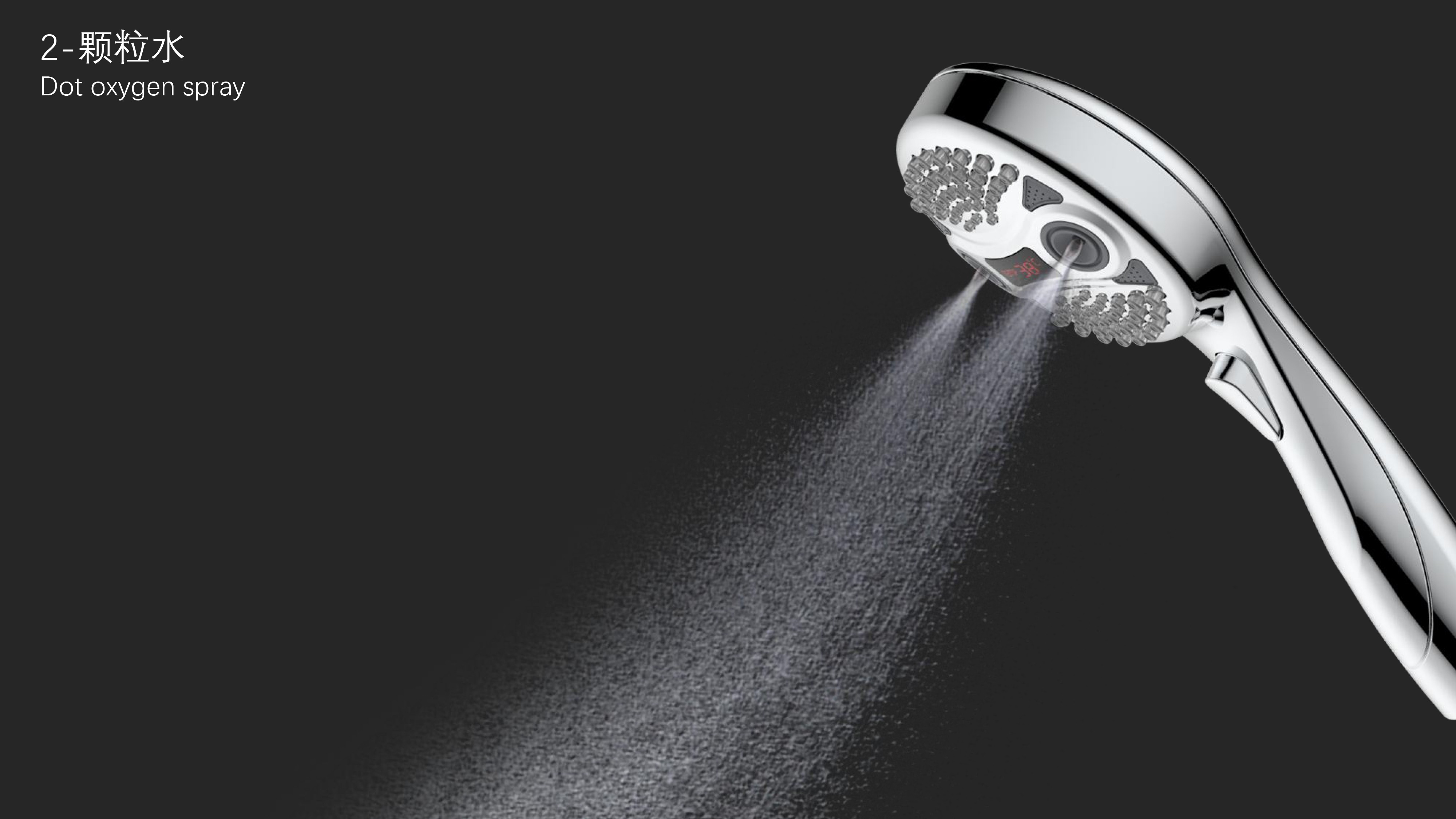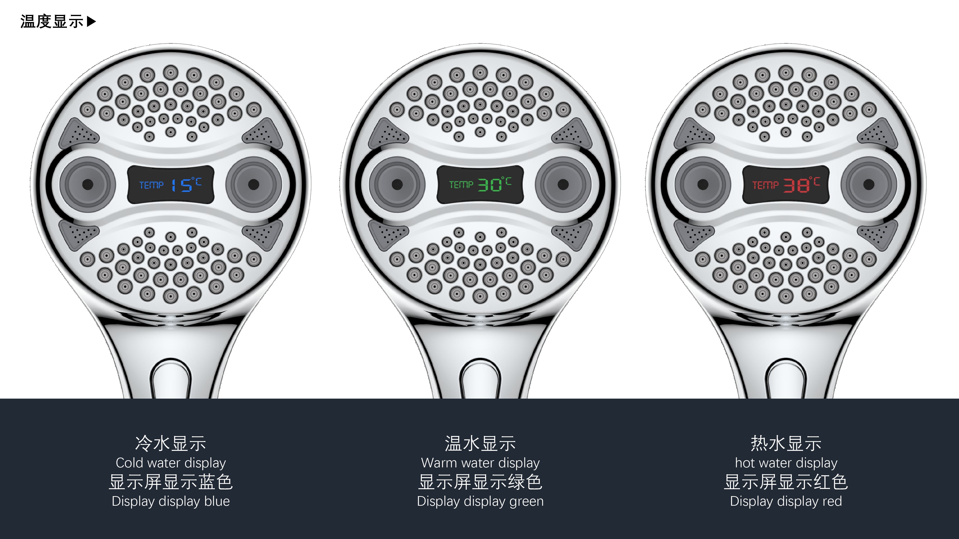 三功能溫顯花灑;獨特E.T.外觀設計;TPR出水孔,輕撥除垢;LED三色出水,看得見的水溫;按鍵切換三檔模式出水;握感舒適防滑
